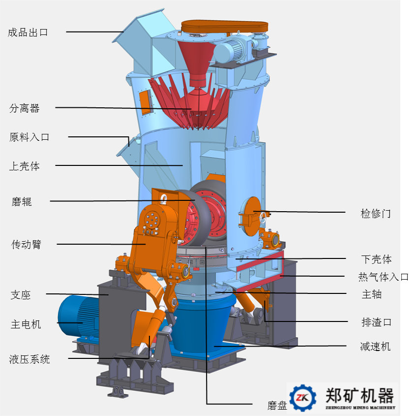 3、烘干能力強,利用輔助熱源可烘干粉磨水分高達12%-15%的物料;