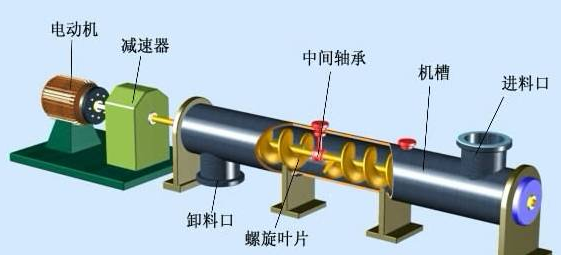 螺旋輸送機由聯軸器、進、出料口、主軸裝置、軸承座裝配、中間軸承、底架裝配、支腿及驅動等組成。螺旋輸送機本體由螺旋葉片、槽體、主軸裝置裝配而成。驅動裝置為電機、減速機。